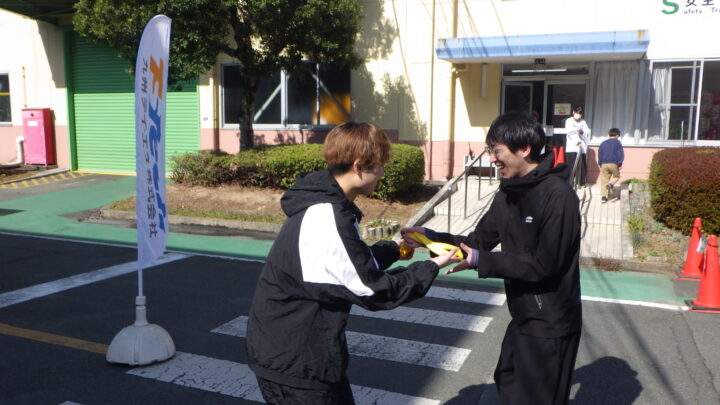 ↑ 仲良くタスキの受け渡し!